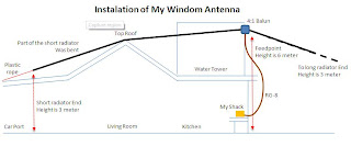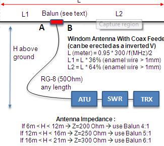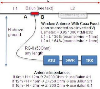 Sebuah antenna All-Band dari kawat sangat mudah dan membutuhkan waktu dan biaya yang sangat sedikit, dari kacamata saya, sangatlah sayang bila kita harus membelinya dalam kondisi jadi dengan harga yang tidaklah murah. Banyak sekali all-band atau multiband antenna dari kawat yang bisa kita jumpai dan memungkinkan untuk dibuat, diantaranya yang cukup termashyur adalah Windom Antenna (OCF Dipole = Offset Centre Feed Dipole), G5RV, G7FEK, Loaded Dipole, dll. Namun disini saya akhirnya mempersunting Windom Antenna dengan transmition line menggunakan COAX 50 Ohm bukannya menggunakan Twin-Lead 300 atau 400 Ohm, karena setelah saya cari di Pasar Cikapundung keberadaan Twin-Lead 300 Ohm sangatlah jarang, kalaupun ada merupakan barang sisa perang dan kualitasnya sangat jelek dimana serabut kawatnya sangat sedikit dan ringkih, dan satu lagi harganya juga lebih mahal dibandingkan dengan seutas kabel coax RG-58A/U per-meternya, mungkin barang langka jadi yaa harus mahal kali … hihihi. Kedua, kenapa Windom, karena panjang overall QTH saya cuman 20 meter terus di belakang QTH ada balong atau tanah kosong yang belum digarap dan jarang disambangi pemilikinya, jadi Windom Antenna cocok sekali, karena radiator pendeknya yang membutuhkan panjang kurang dari 15-an meter udah bisa masuk ke lahan saya plus feedpoint-nya tepat di atas meja kerja saya.