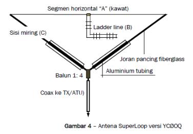 Namun demikian, modifikasi apapun yang dilakukan, perlu diingat “pakem” yang menyebutkan bahwa pada antena Loop aperture (bidang tangkap), ketinggian bagian antena dengan distribusi arus (current distribution) yang maxima dan ketinggian feedpoint merupakan faktor utama yang menentukan keberhasilan kinerjanya – dan karenanya bentuk Inverted Delta seperti pada Gambar 1 adalah merupakan bentuk “kompromistis” yang paling mendekati bentuk Loop yang ideal. Dick N1RCT dalam ulasannya juga menyebutkan bahwa segmen diagonal (sisi miring “C”) cukup membantu dalam mengurangi gejala QSB (fading) yang sering dijumpai pada QSO DX yang menggunakan antena dengan polarisasi horizontal.
