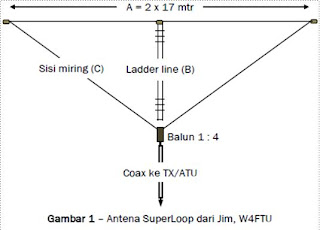 Orèk-orèkan ini ditulis dengan merujuk ke gambar TANPA SKALA di situs www.radioworks.com, dan karenanya hanya ukuran segmen horizontal (“A” pada Gambar 1) yang bisa “dipegang” sebagai rujukan utama bagi calon pembiksen di sini. Ukuran sisi miring “C” dan Ladder line (aslinya menggunakan open wire buatan pabrik dengan impedansi 450 ohm) harus dieksperimen dengan memahami cara kerja dan “akal-akalan” yang digariskan Jim W4FTU seperti yang diwedar di atas.