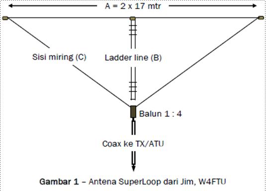 Orèk-orèkan ini ditulis dengan merujuk ke gambar TANPA SKALA di situs www.radioworks.com, dan karenanya hanya ukuran segmen horizontal (“A” pada Gambar 1) yang bisa “dipegang” sebagai rujukan utama bagi calon pembiksen di sini. Ukuran sisi miring “C” dan Ladder line (aslinya menggunakan open wire buatan pabrik dengan impedansi 450 ohm) harus dieksperimen dengan memahami cara kerja dan “akal-akalan” yang digariskan Jim W4FTU seperti yang diwedar di atas.