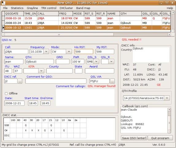 CQRLOG is an advanced ham radio logger based on MySQL database. Provides radio control based on hamlib libraries (currently support of 140+ radio types and models), DX cluster connection, QRZ callbook (web version), a grayliner, internal QSL manager database support and a most accurate country resolution algorithm based on country tables developed by OK1RR. CQRLOG is intended for daily general logging of HF, CW & SSB contacts and strongly focused on easy operation and maintenance.