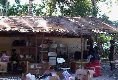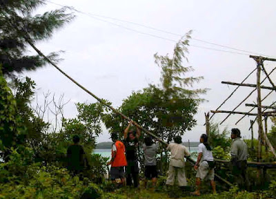 Gbr 7. Gambar di kiri merekam kegiatan mendirikan antena tx untukband 160m dengan bambu. Perhatikan rangka atas untuk Gubuk #1 yang belum diberi atap rumbia, di sisi kanan gambar