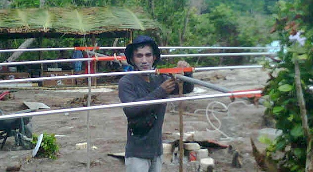 Gbr. 9. Rizal, YD1ORZ sedang merakit antena Yagi, homebrew, untuk 28 MHz. Di latar belakang tampak gubuk operasi di pinggir hutan bersemak lebat