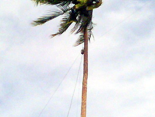Di batang pohon kelapa setinggi 20m inilah kami menempatkan kerekan(pulley) untuk feedpoint + balun 1:1 bagi antena TXfull-sized dipole.