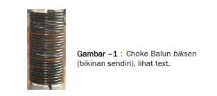 Untuk mencegah nantinya dinding luar shield/braid pada coax feeder line ikutan memancar (= “common- mode current” atau I4) maka di ujung feeder line (sebelum di-konèk ke pangkal lilitan helikal) seyogy- anya dipasangkan sebuah Choke Balun yang dibuat dari 5 – 6 mtr coax RG-58 yang di-lilit rapat-kan (close wound) pada sepotong pipa PVC dia. 2 – 3“ (Gambar-1 berikut).