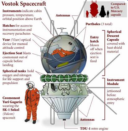 Sebagai seorang seorang militer (Letnan pada AU Uni Soviet), apalagi sebagai penerbang, ukuran tubuh Gagarin yang hanya 5’2”” (= 157 cm) jelas termasuk pendek, tapi justru dengan ukuran tinggi segitulah dia menyisihkan German Titov (yang akhirnya jadi kosmonot ke 2 Uni Soviet yang mengorbit Bumi selama 25 jam 18 mnt pada tgl 6-7 Agustus 1961 dengan pesawat angkasa VOSTOK II), mengingat modul awak pesawat generasi pertama tersebut yang begitu sempit dan sesak (gambar di bawah).