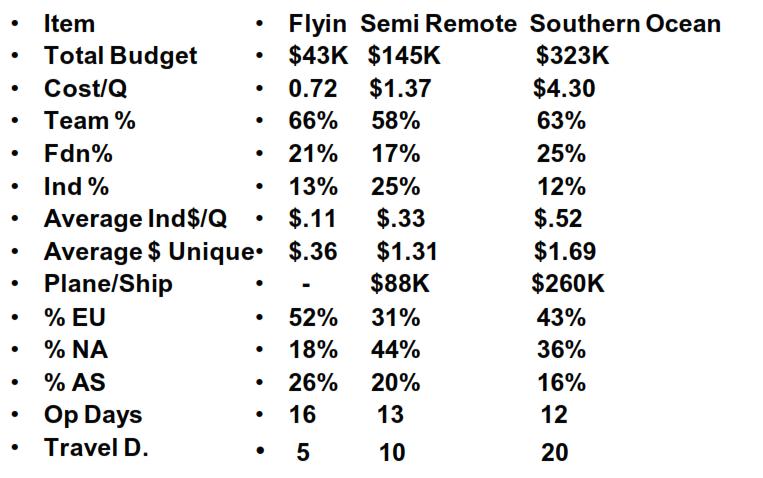 • Average cost, $323,000, average cost per QSO: $4.30. Individual contributions (pre/post): 52 cents per Q/ $1.69 per unique callsign.