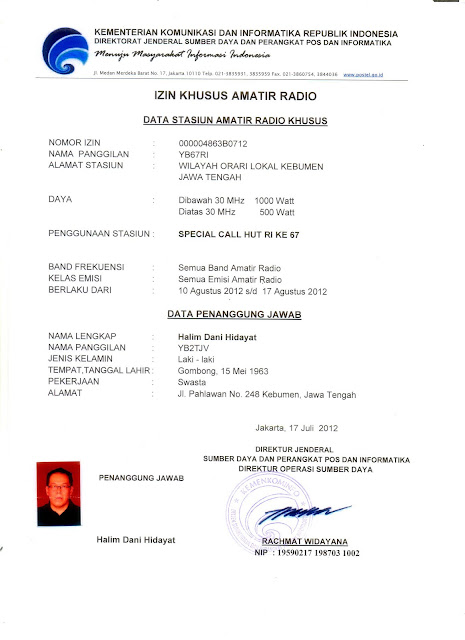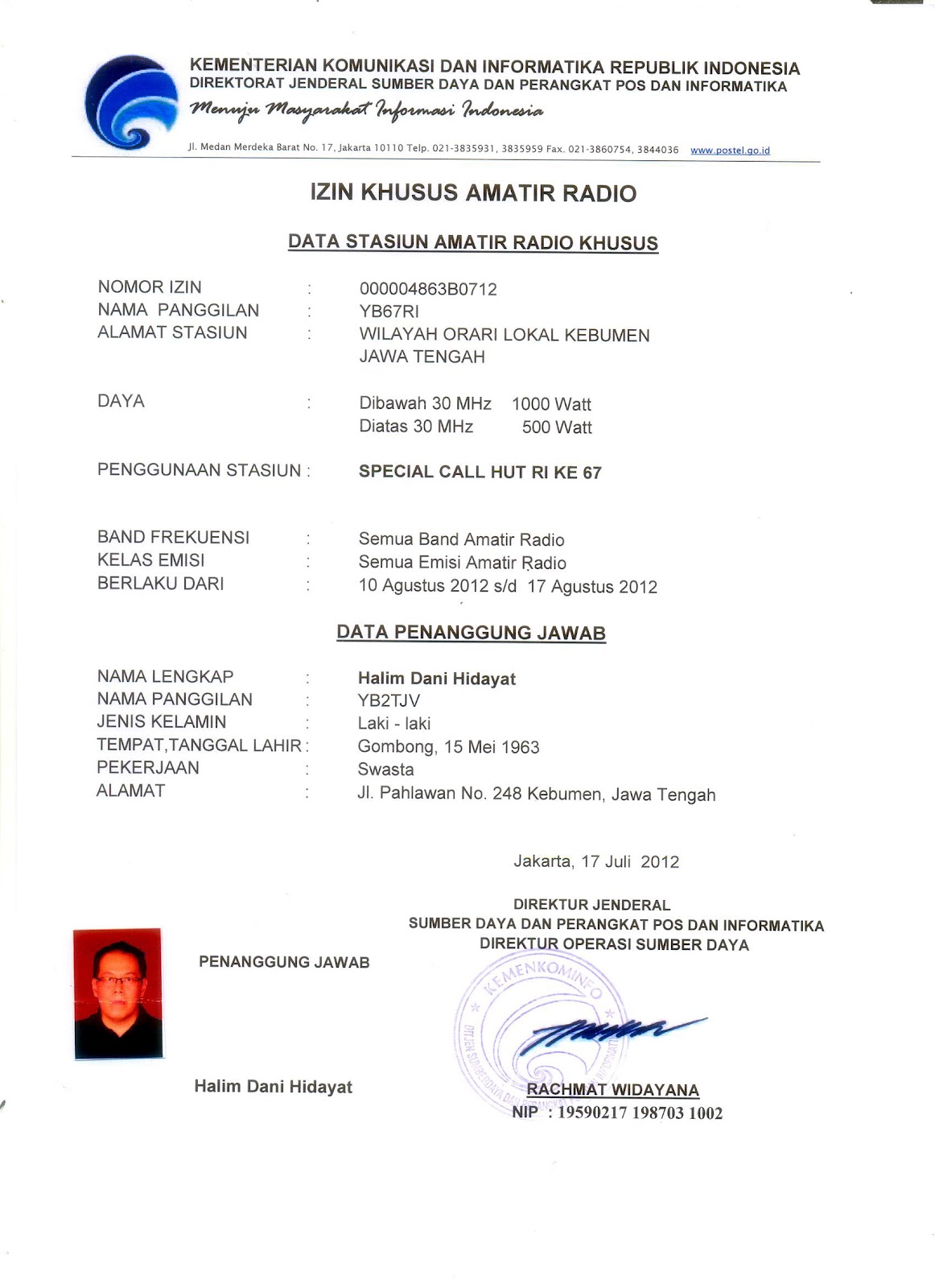 YB67RI, Special Event Station, QRV August 10,2012 00UTC – August 17,2012 24.00UTC, all mode, all band by all operators around Indonesia call areas, supported by ORARI and YBDXC