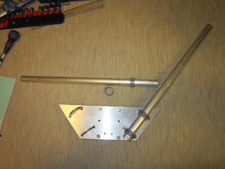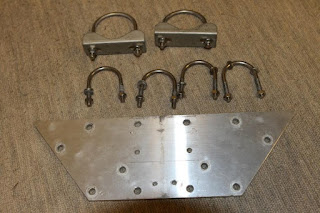 Untuk braket mounting dibuat dari bahan plat aluminium ukuran sekitar 30 cm x 10 cm dengan ketebalan sekitar 6 mm. Plat tersebut harus dibuatkan lobang untuk dudukan U klem. Klem untuk memegang elemen terbesar (paling bawah) adalah U klem berukuran sekitar 40 mm dg diameter 6 mm (diameter lobangnya dibuat 7 mm). Lubang pada plat tersebut harus diatur sedemikian rupasehingga nantinya sudut antara elemen kiri dan kanan sebesar sekitar 65 derajat. Plat dan klemnya terlihat Seperti pada gambar 4