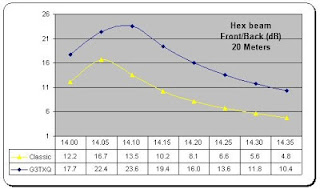 The front/back gain ratio of the G3TXQ hexagonal beam is dramatically better than the classic design. This means that unwanted signals coming into the transceiver from the back of the beam will be much less than with the classic hex beam.