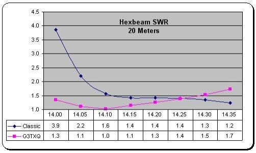 The SWR of the G3TXQ hexagonal beam is dramatically better on the low end of the band making it easier to couple the transceiver to the antenna for maximal power transfer.