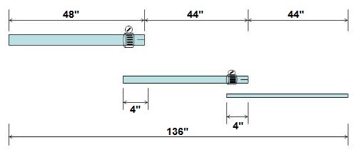 The thinner pieces slip easily into the next larger pieces for a telescoping structure that will be 136″ long when assembled. Each section is 48″ long. Note the two clamps that tighten the three sections together. You should assemble six such telescoping spreader arms.