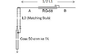 Satu sayap (= 1/2 L1 pada gambar) terdiri dari 3 seg- men, masing-masing segmen A = B dari kawat atau kabel biasa sepanjang 1/4λ pada design frequency di 20m (= +/- 5mtr), sedangkan segmen yang di tengah dibuat dari coax RG-58 yang dipotong SAMA PANJANG dengan segmen A dan B (TANPA memperhitungkan VF/ Velocity Factor) — seperti yang bisa diamati pada gambar :