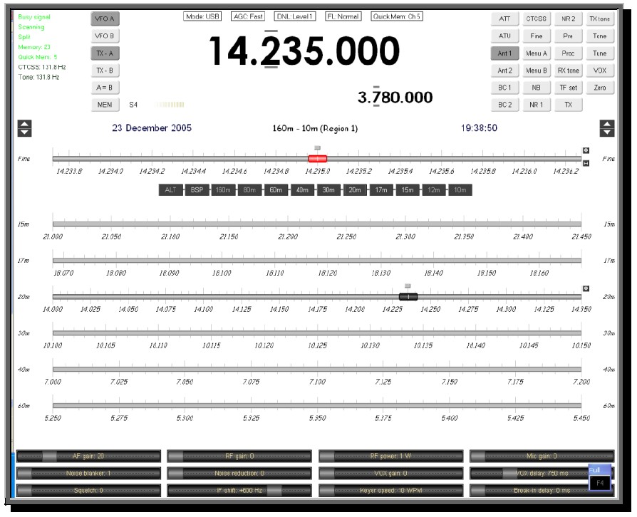 HRD has been designed to make radio interfacing as simple as possible. Simply use the drop down menus to select the Company and radio being used. For the COM Port and Speed settings, simple use the drop down menus again and select ‘Auto Detect’ for both. If you are using an ICOM rig as depicted above, then the CI-V Add will be filled in by the program depending on the ICOM Model that was selected in the Radio box. Next, hit Connect and you should be up and running. If you run into problems, simply refer to the manual.