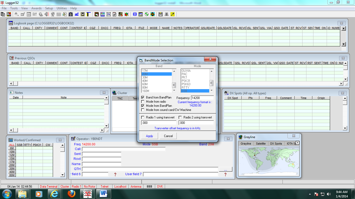 Langkah selanjutnya adalah mengatur band plan… Click pada tulisan Freq nanti akan keluar kotak seperti pada gambar di atas. Isi kolom Frequency dengan 14200, Band from Band Plan di centang, demikian juga Mode From Band Plan di centang. Lalu click Apply.