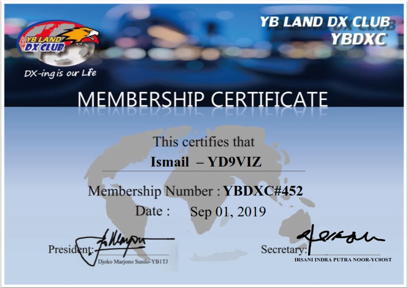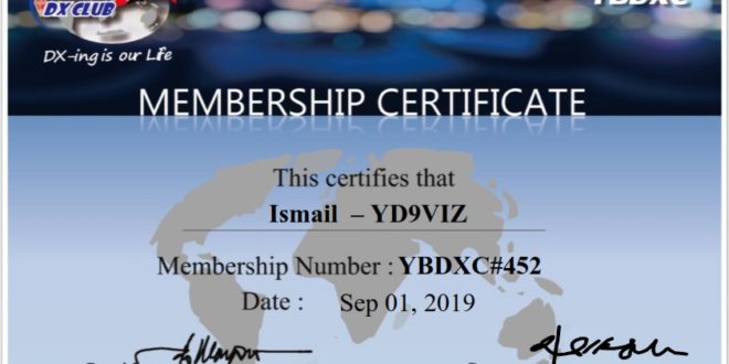 Welcome YD9VIZ As YBDXC#452 Administrator 2 September 2019 Certificate, Member, YBDXC 487 Views Share tweet CERTIFICATE DOWNLOADsertificate-YBDXC YD9VIZ