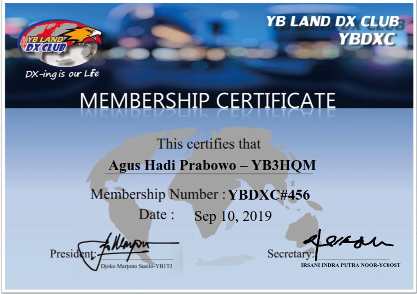 Welcome YB3HQM As YBDXC#456 Administrator 10 September 2019 Certificate, Member, YBDXC 558 Views Share tweet DOWNLOAD CERTIFICATEsertificate-YBDXC YB3HQM
